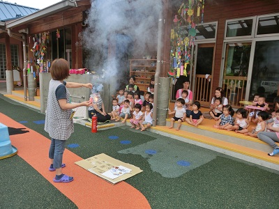 ● 避難後は、先生から「花火遊びの注意点」と、「遊び終わった後の始末方法」や「消火器の使い方」を学びました。