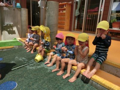 ● 今日にも梅雨明け宣言が出そうなので、以上児みんなでプール掃除をしました。