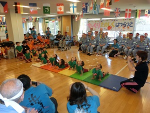 O養護老人ホーム「浜美荘」の運動会で緑組さん12人が、いちごちゃんと体操をご披露しました。
