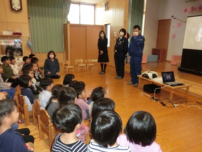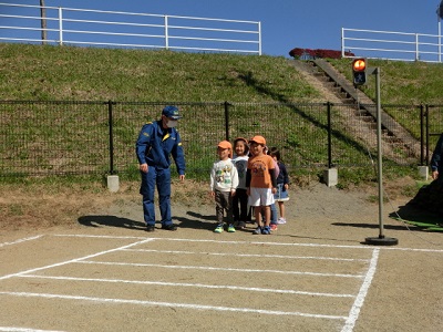 [R4.10.31(月)] ● 今日は、園舎移転後、初めての交通安全教室でした。参加者は3歳以上児クラスでした。 ● 講師は、近くの山都警察署にお願いしました。 ● ホールでは「ガチャピンと学ぼう!こうつうルール」のDVD動画を見て学びました。(真剣に見ていました) ● 場所を第2園庭へ移動し、横断歩道の渡り方を教えていただきました。 ● 最後に恒例の「パトカー見学会、撮影会」で大喜びでした。 [1回]