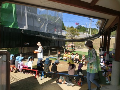 [R4.10.13(木)] ● 今日は、先週、保護者から頂いたサツマイモで「焼き芋」を作りました。 ● 焼き芋の準備をしていると、なんと、そこへサツマイモを頂いた保護者の野菜農家グループ4名がお越しになり、減農薬野菜をたくさん頂きました。ありがとうございました。 ● 焼き芋は時間がかかるので、事前にふかした状態で焼きました。中には焼き芋を落としてしまう子どももいましたが、みんな、おいしいと言って食べていました。 ● そのあとは、給食がおいしくなるようにいっぱい遊んでいました。 [1回]