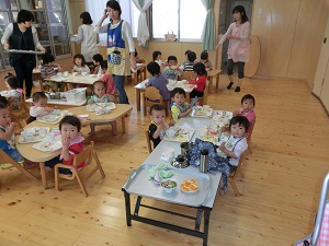 O 赤組(1歳児)の4人の子供たちが、お兄ちゃん・お姉ちゃん23人と一緒にランチルームでお昼ごはんを食べました。