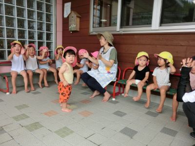 [R5.8.9(水)] ● 台風6号が近づく中、雨がやんでいたので、3歳未満児さんたちが外に出てみました。 ● やがて、雨がポツポツと降ってきたので園舎の軒下で、ベンチに座り「むすんでひらいて」などの歌を先生のリードで歌い始めました。 ● 子ども達は楽しそうに歌い、それを先生達はうれしそうに聞いていました。 ● 小雨が降る中、微笑ましいひと時をみんなで過ごしていました。私も、その場面がうれしくて急いでカメラを持ち出し、シャッターを押しました。 [1回]