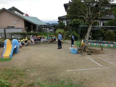 [R7.10.23(木)] ●今日は、山都警察署から来ていただいて、2~5歳児の交通安全教室をしました。 ●最初は、ホールで紙芝居を見ました。夕暮れに黒い服を着たお姉さんと、白い服を着た弟の子が道を歩いている場面では、警察官の方から「何が危ないと思いますか?」と尋ねられ、子ども達からは「暗いので危ないです」という答えがありました。 ●私たちの想定では、「黒い服を着ているから見にくいです」だったのですが、その上をいくいい回答でした。警察官の方も感心しておられました。 ●その後は、第2園庭に出て、横断歩道の渡り方を習いました。みんな、よく頑張りました。 [1回]