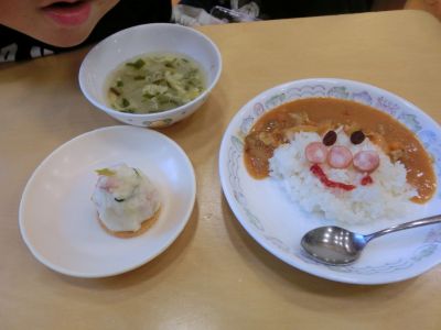 ● 今日の給食は、「ポテトサラダとクッキーと★のクリスマスツリー」と、「アンパンマンカレー」でした。