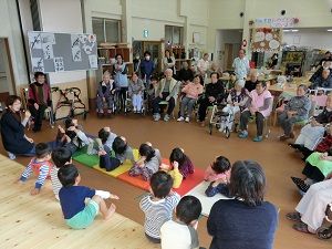 O特別養護老人ホーム「風の木」で緑組の園児たちが、社会見学を兼ねて、歌・演技を披露しました。