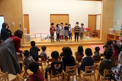 ● 今日は、久しぶりに全園児が集まって、年長さんとの「お別れ会」です。