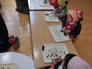 ●みんな、最後まで食べる(なめる)のを我慢して作りました。ただ、何人かは、マスクがよだれで濡れていました。においやおいしそうな形・色で自然と出ていたようでした。とても、おいしそうでした!