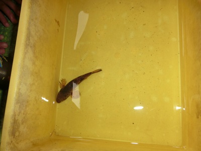 [R4.11.15(火)] ● 3歳以上児が園の近くの田んぼで昆虫探しをしていると、なんと「魚」がいました。 ● 事務所で園長が仕事をしていると、子どもたち4.5人が「園長先生、魚がおったよ!」と、大きな声で廊下を走ってきました。 ● 黄色い容器を覗くと、そこには体調15cmの「ドンカッチョ(ドンコ)」がいました。 ● おそらく、小さいときにかなり離れた上流の大きな池から流れ着いたかなと、先生達と想像しました。 ● 今からどうしていくのか? 子ども達が考えていくでしょう。 [4回]