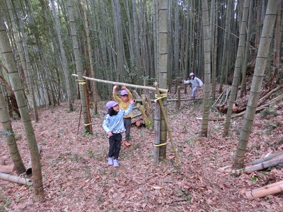 ● 竹で作った、滑り竹(台)、竹(鉄)棒、平均竹(台)で遊びました。楽しかったようでした。いろいろと注文がありました。
