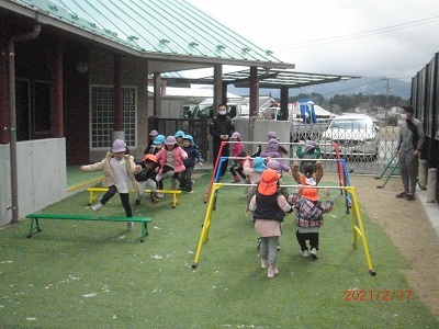 ● そして、雪が止み、少し明るくなったので、3歳以上児を連れて、今回設置した鉄棒・平均台、そして、登降棒の遊び方を教えていただきました。